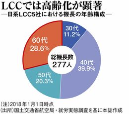 日系LCC5社では、パイロットの高齢化が著しい。特に機長は60代が3割弱を占める。乗務年齢は現在68歳が上限で、あと数年で退職となってしまう。