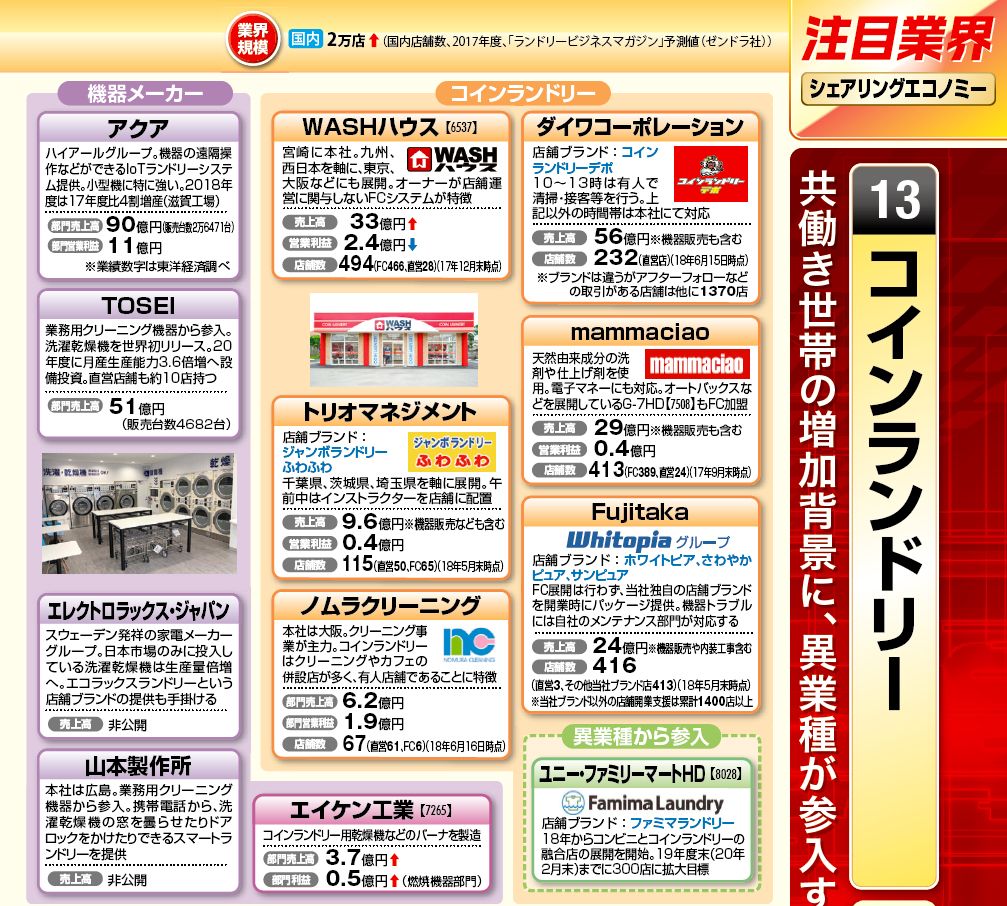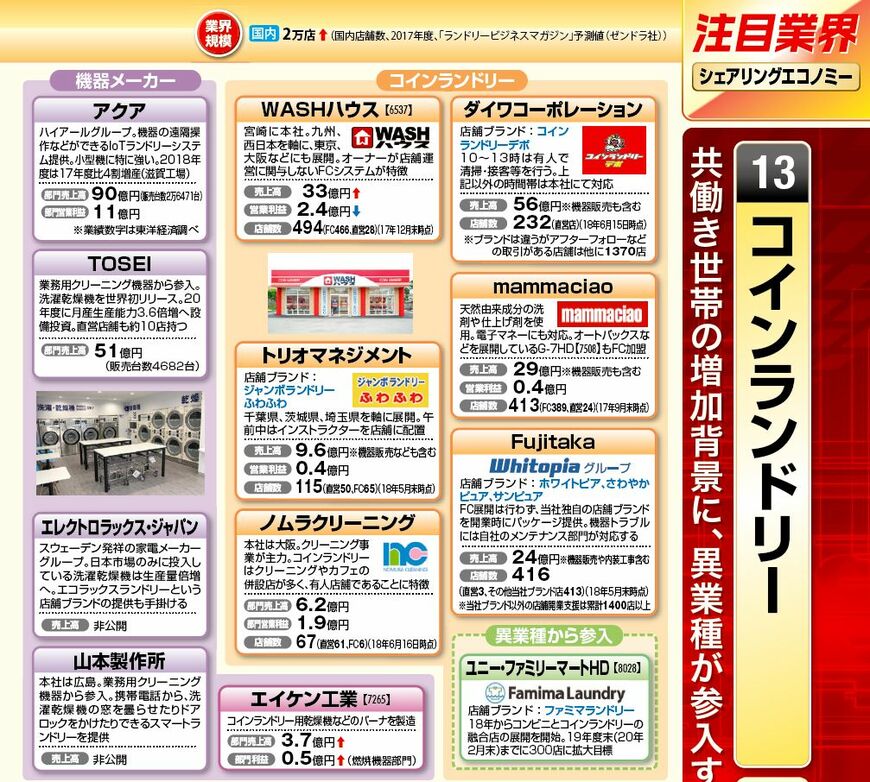 『会社四季報 業界地図』では、こうした最新の業界動向から「オールドエコノミー」までを網羅。主要な業界プレーヤーはもちろん、その関係性までを解説している。2019年版では、特にシェアリング・エコノミーに注目。カーシェアやシェアオフィスなども紹介している。「モノ・サービス・場所などを、多くの人と共有する」という意味では、コインランドリーもその一形態といえそうだ。