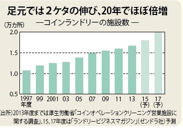 赤やオレンジ、青といった外装で、店内が明るく、清潔そうな店舗。ひときわ目を引く看板。最近、街のいたるところでやけに目立つのがコインランドリーだ。いまや店舗数は右肩上がり。この20年で倍増、さらに増殖中だ。2017年度時点では国内に約2万店と推計されている。