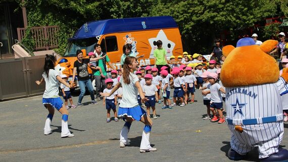 9月初旬、横浜市磯子区の岡村幼児園に、ベイスターズのマスコットをあしらった車、スターマン号がやってきた。