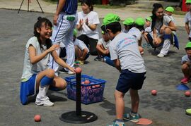 担任教諭は、「投げるという動作は、体の向きとか体重移動とか難しいですが、本物の方たちに学べたということが自信になってくると思います。この秋から1年生はボール投げの授業が始まるので、いい導入になりました」と語った。