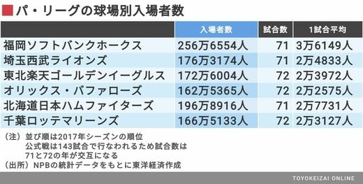 もちろん、パ・リーグ球団も、試合入場者数の増加に向けてそれぞれの方法で取り組んでいる。各球団にとって、試合入場者数は持続的運営を実現するために必要な入場料収入の増加を図るうえで最も重要な指標だ。