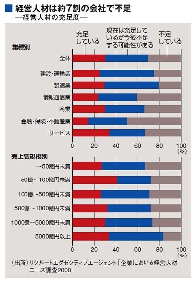 経営幹部層に特化した人材紹介会社、リクルートエグゼクティブエージェントの調査によると「経営人材が充足している」とするのは回答企業の約3割にすぎない。「今後不足する可能性がある」「不足している」を含めると、約7割は経営幹部層の確保に悩んでいるのが現状なのだ。