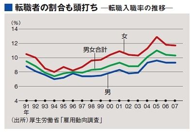 企業の採用意欲を表す「求人広告掲載件数」は、今年4月から対前年同月比でマイナスに転じている。そもそも転職者の割合自体、2005年をピークに頭打ちとなっていた。景気後退となれば、今後は一段と転職市場の冷え込みが予想される。