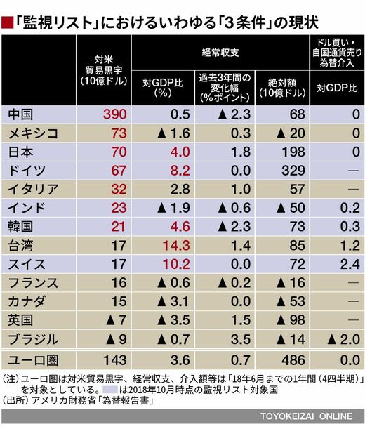 2016年4月に掲載が始まった監視リストは中国・日本・韓国・ドイツの4カ国がオリジナルメンバーとして名を連ねており、実際、この4カ国はドナルド・トランプ政権の批判の矛先として常連である。改めて監視リスト入りの基準を確認しておくと、①対米貿易黒字が年間200億ドル以上ある、②経常黒字がGDP(国内総生産)比で3%以上ある、③一方的かつ継続的な外貨買い為替介入を12カ月間でGDP比2%以上行った――のうち、2つを満たすと「監視リスト」、3つを満たすと「為替操作国」として認定されることになる。