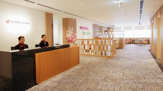 エレベーターを降りた瞬間から、高級ホテルを思わせるデザイン性の高い空間が利用者を待っている。広々としたエントランスでは2名の受付スタッフが出迎え、来客時の案内からビジネスサポートまできめ細かく対応してくれる。居心地のよい共用スペースもまるでホテルのラウンジのようだ。