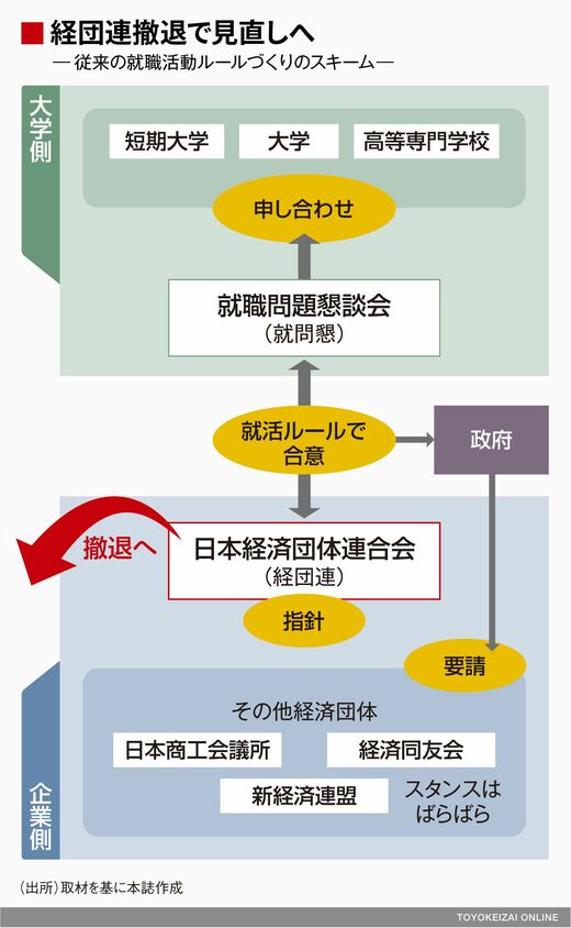 具体的には、文部科学省が行司役を務め、両者が会合。そこで合意した内容を、経団連が「指針」として会員企業に遵守を呼びかけ、就問懇は「申し合わせ」として大学側に周知する格好だ。
