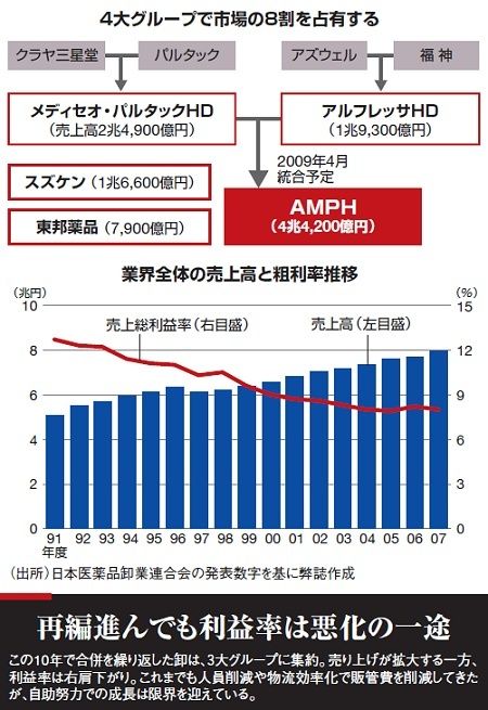 この10年で、医薬品卸の社数は約半分に激減した。買収に次ぐ買収で、大手4社が業界で約9割ものシェアを握る巨大グループに集約。さらに今年10月、首位のメディセオ・パルタックホールディングスとアルフレッサが経営統合を発表し、来春には4兆円規模の最大卸アルフレッサ・メディパル ホールディングス(AMPH)が誕生する。