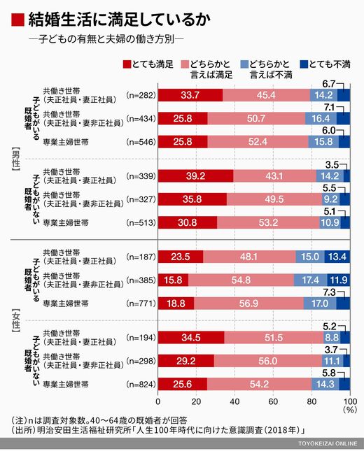 「とても満足」の割合については、夫婦とも正社員の世帯が男女ともに最も高くなっています。また、子どもがいない既婚者のほうが子どものいる既婚者よりも高く、夫婦とも正社員で子どもがいない世帯では、男性39.2%・女性34.5%となっています。