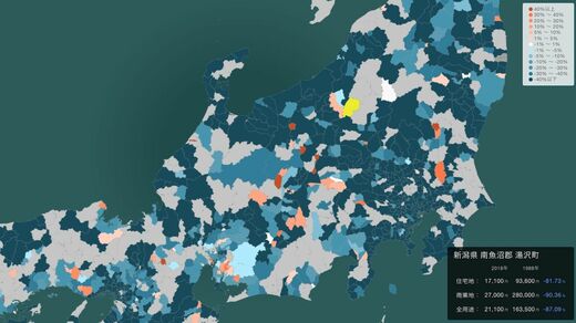 中でも最も下落率が大きいのは、日本有数のスキーリゾート地として知られる新潟県の南魚沼郡湯沢町。1987年には原田知世主演の映画『私をスキーに連れてって』が公開されるなど、バブル期のスキーブームを背景にリゾートマンションが乱立。1988年の平均地価16万3500円から1993年には最高値19万0100円をつけたが、バブルの崩壊につれて暴落。2018年には2万1100円と30年前の7分の1以下となった。