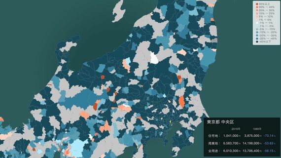 当然ながら、マップを見ても30年前と比べるとほとんどの市区町村で基準地価が下落していることがわかる。2018年と地価が比較可能な1507市区町村のうち、9割を超える1384市区町村で平均地価が下がっている。