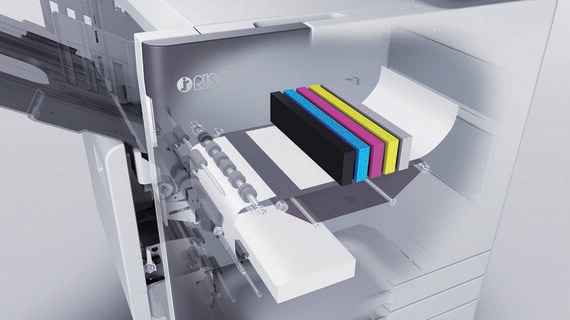 この圧倒的スピードは、同社の高い技術力があってこそ。「オルフィスGD」は、A3ワイド用紙の短辺を一度に印字できるライン型インクジェット印字ヘッドを5色並列に配置している。さらに、精密な用紙搬送機構により、印刷ずれのない高速プリントが可能になる。