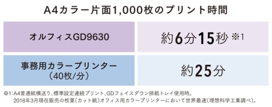 (※1)オルフィスGD9630プレミアム/GD9630/GD9631の場合。A4普通紙片面横送り、標準設定連続プリント、GDフェイスダウン排紙トレイ使用時。2018年3月現在販売の枚葉(カット紙)オフィス用カラープリンタにおいて世界最速(理想科学工業調べ)