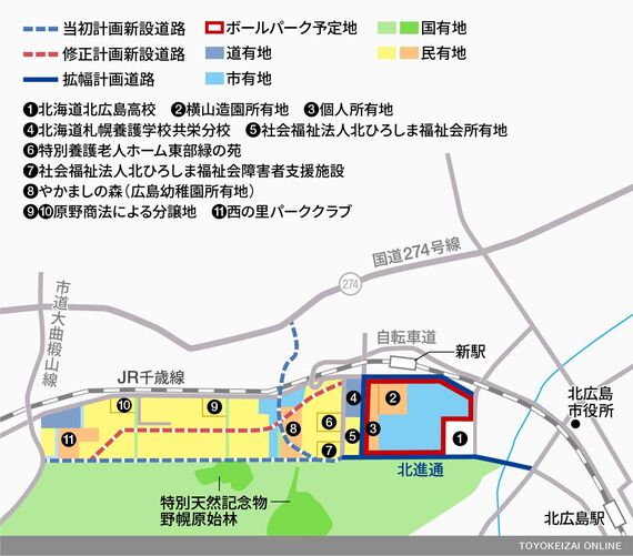 そうなると、マイカーによる来場者の導線となるアクセス道路はより重要性を増す。今年2月に北広島市が地元で説明会を開催した時点では、北広島駅西口からボールパーク手前までの間の新交通システムのほか、敷地を取り囲む道路の4車線への拡幅や、国道274号線からと市道大曲椴山(おおまがりとどやま)線からの2路線を、敷地南側の北進通に接続させるアクセス道路の新設が想定されていた。