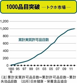 サプリとともに健康食品と呼ばれる特定保健用食品(トクホ)も、最近ではサントリー食品インターナショナルの「特茶」や花王の「ヘルシアコーヒー」などがヒットを飛ばしており、消費者の健康意識の高さがうかがえる。昨年は1991年のトクホ制度創設以来20年越しで累計1000品目の大台を突破した。