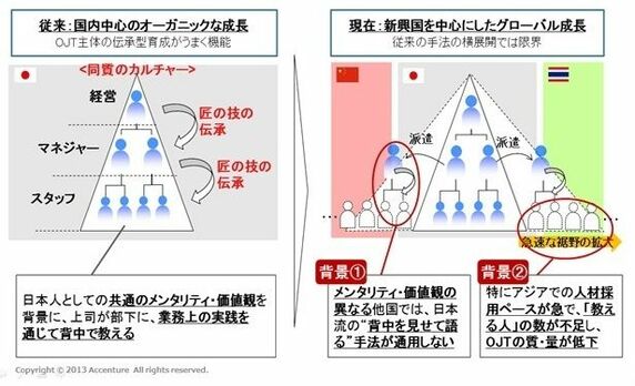 従来の国内中心のオーガニックな成長局面では、日本人としての共通のメンタリティ・価値観を背景に、上司が部下に、業務実践を通じて背中で教えることが可能だった。だが、新興国への進出などグローバル成長を加速化させている局面では、あらゆる面で従来の手法の横展開では限界を来している。この理由は、大きく2つある。