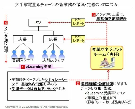 2000年代中盤に、過去最大のシステム投資により、店舗の発注・返品・修理回りの業務・システムを刷新した、グローバルに展開するある大手家電量販チェーンでは、十数万人超のさまざまな人種・年齢・バックグラウンドの店舗スタッフに、バラつきなく、早期に新業務に習熟させる必要があった。その際、単なるeラーニングの提供にとどまらず、“変革マネジメントチーム”を立ち上げ、業務理解・徹底状況に関するデータを定期的に収集させ、組織長に異常値をレポートさせた。そして、組織長から職制を通じて指導を繰り返すことで、十数万人の店舗スタッフに対する早期の業務定着化に成功したのである(下図)。