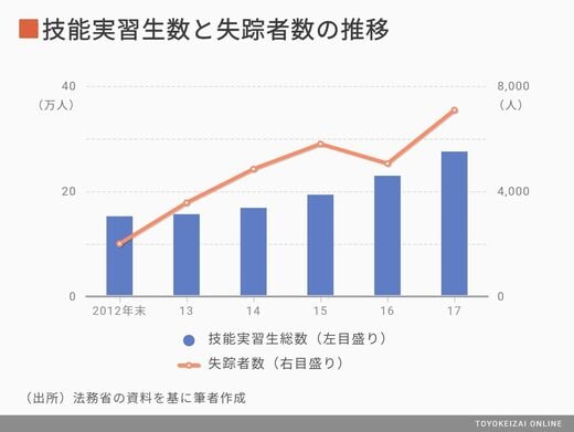 このような実態の中、外国人技能実習生の失踪が後を絶たないことが社会問題化しています。技能実習先企業とのトラブル、低賃金、過酷な労働に耐えられなくなったなどの理由で失踪した技能実習生は、法務省の統計によると、2017年は7089人にも達し、過去最高を更新したということです。技能実習生の母数の増加に伴い、失踪者数も増加の一途をたどっているという傾向が見られます。