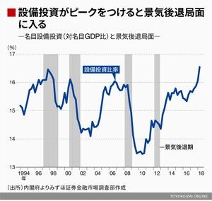 2018年7~9月期の名目設備投資の対名目GDP比は16.65%と、現行統計(1994年以降)で最高となった。過去最大の1997年10~12月期の16.45%を2期連続で上回った格好だ。すでに設備投資が過剰な状態で、7~9月期の減少をきっかけに、設備投資のGDP比が低下していく可能性もあるだろう。