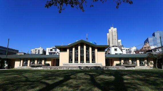 芝生が美しい敷地には低層の建物が連なる。“プレーリーハウス”といわれるこのスタイルは、ライト氏建築の典型だ。ライト氏は地元であるアメリカ中西部の平原に、こうした作品を多く遺している。しかし、日本の東京・西池袋にそんな建築が実現し、築約100年を経て文化財となっているのは不思議なことにも思える。