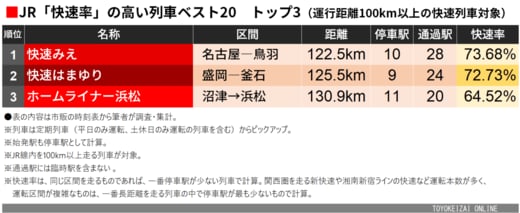 2位は、岩手県の盛岡と釜石を結ぶ「快速はまゆり」。快速率72.73%は、一般的な特急と比べても遜色ないレベルだ。以前は急行として運転されていたが、2001年より快速に格下げされたという歴史があるため、現在も急行時代に使用していたリクライニングシートの車両で運行されている。
