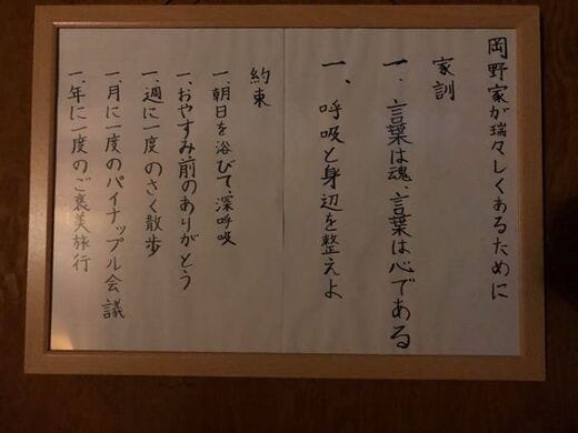 家訓の1つ目は、歌人である春樹さんの祖父の教えだ。2つ目や約束事は夫婦2人で作ったもの。子どもが生まれ、日々の忙しさに翻弄されても、深く呼吸をし、心身や環境を整え、自然や楽しいことに触れ、相手への言葉に気をつけよう、という意味だ。そして月に1度はパイナップルなど新鮮な果物を食べながら話をしよう。遠回りに感じるかもしれないけれど、それらが「みずみずしい岡野家」を作っていくための指針になった。