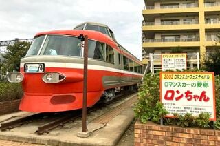 各駅停車で3駅、ホームからも目の前に見えるが、東口に降り立つと、そこには先日勝島さんに見せていただいた写真と同じ、ロマンスカーNSE(3100形)の先頭車両が鎮座していた。2002年に付けられた愛称は「ロンちゃん」。小田急電鉄が譲渡し、月に2回ほど車内を公開しているらしい。ロンちゃんの周りでは、子どもたちが鬼ごっこをしていた。にぎやかな声に囲まれて、第2の人生を幸せに過ごしているようだった。