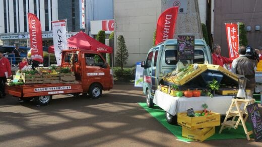 東武宇都宮駅から100mほど進んだところにある広場「オリオンスクエア」では、新車の軽トラの展示もあった。地元のスズキとダイハツ工業のディーラーが、ディスプレーを施した軽トラを2台ずつ展示していた。スズキとダイハツは軽トラ業界では最大のライバル同士であるが、ここでは全員が2つのブランド名を入れたブルゾンを着ており、呉越同舟という雰囲気だった。