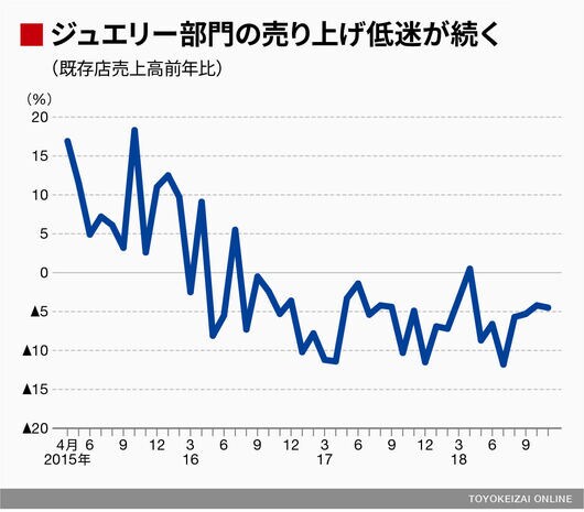 はたして、4℃の高級ブランド化戦略は成功するのか。4℃は1年前のクリスマス商戦で大苦戦し、2017年12月の月次売り上げは前年同月比で12%近く落ち込んだ。当面の焦点は今年12月の月次売り上げが、ひとまずプラスに転換するかどうか。今後の行方を占ううえでの試金石となりそうだ。