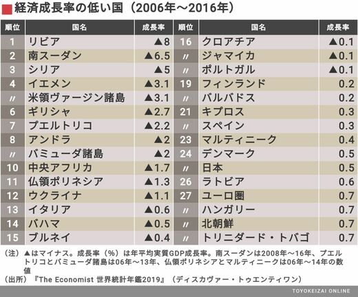 そこで気になるのが、日本の経済成長率の低さだ。経済成長率の低い国ランキングを見ると、日本は世界の中でも下のほうにいる。