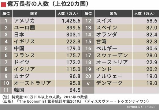 日本が有する「資源」として最初に注目したいのが、金融資産である。純資産が100万ドル以上の人数を示した「億万長者の人数」ランキングを見てみると、1位アメリカ、2位日本、3位イギリスとなる(ユーロ圏は国ではないので外して考える)。