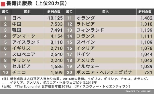 人口100万人当たりの新刊点数のランキングを見ると、日本は並みいる先進国を抑え、1万点を超え世界1位となっている。これには再販制度(定価販売する制度)という特殊な流通制度が影響していることは否めないが、仮にそれが一因だとしても、これほどの新刊流通を支える豊かな出版文化があることは確かだ。