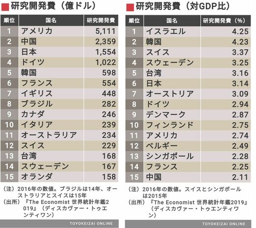 研究開発費のランキングを見てみても、日本は世界3位(対GDP比では6位)であり、イノベーションの創出にお金を十分にかけていることがわかる。