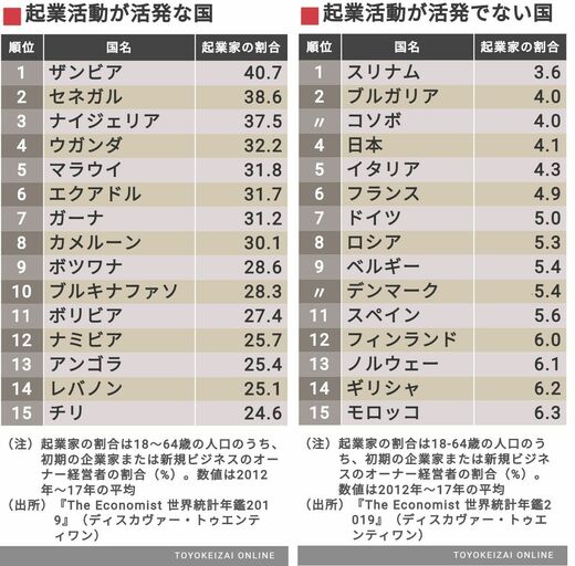 一方で、クリエーティブ活動の指標の1つである「起業活動」のランキングを見ると、日本は下から数えて4番目に位置している。