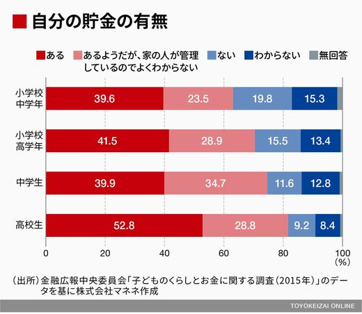 だが、そのうちのそれぞれ23.5%、28.9%が「貯金はあるが、家の人が管理しているのでよくわからない」と回答している。つまり、貯金はしているものの、自分の意志で貯金をしているというよりは、親から言われてなんとなく使わずに預けている状況なのだろう。