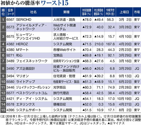一方、ワースト15社は上場直後に投機的な資金が集中し、高騰した株価が急激にしぼんだケースが多い。HEROZもワースト4位にランクインした。公開価格4500円に対して初値は10.9倍の4万9000円をつけたが、直後に急落。その後も株価は1万円台前半と値動きは冴えず、典型的な「初値天井」に陥っている。