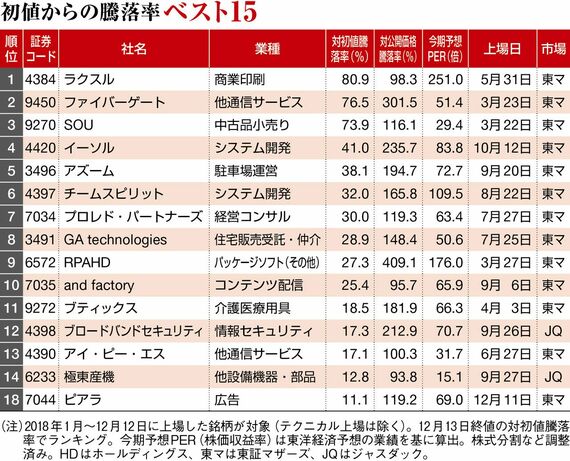 初値からの上昇率でトップのラクスルは、ネット上でチラシなどの印刷を受注し、提携する印刷会社に委託するシェアリング型の事業が主力で、物流分野にも進出している。人手不足問題が大きなテーマになる中でビジネスモデルが評価されたようだ。