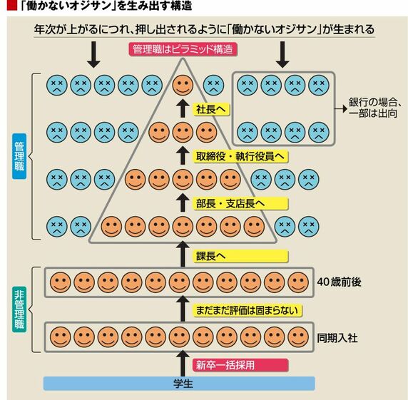 毎年毎年、ところてん方式で社員が後ろから順繰りに押し出されてくる。そういう意味では、「働かないオジサン」を生み出す構造を形作っているのは、毎年の新卒一括採用とピラミッド型の会社組織であると言えそうだ。