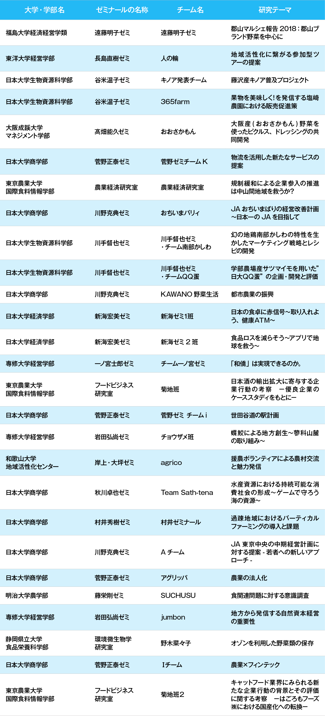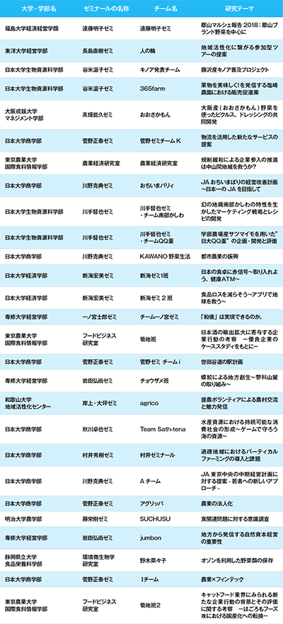 審査委員特別賞には決勝に進出した東京農業大学国際食料情報学部のフードビジネス研究室菊地班、日本大学商学部川野克典ゼミAチームをはじめ、「援農ボランティアによる農村交流と魅力発信」を発表した和歌山大学地域活性化センターの岸上・大坪ゼミナール agrico、「幻の地鶏南部かしわの特性を生かしたマーケティング戦略とレシピの開発」を発表した日本大学生物資源科学部の川手督也ゼミナール チーム南部かしわ、「食品ロスを減らそう~アプリで地球を救う~」を発表した日本大学経済学部の新海宏美ゼミナール 新海ゼミ2班が選ばれた。