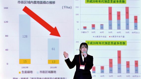 次に発表したのは、日本大学商学部川野克典ゼミKAWANO野菜生活チーム。都市農業と地産地消の結びつきを深めるバスツアー「GO!GO! 農業体験」を実施した経緯や成果についてプレゼンを行った。