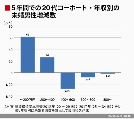 実際に、20~29歳未婚男性がこの5年間でどれだけ未婚から脱出できたのかを、就業構造基本調査の2012年と2017年データからコーホート別年収別に算出してみました。グラフでマイナスとなっているのは、未婚のまま年収が上がったという意味です。