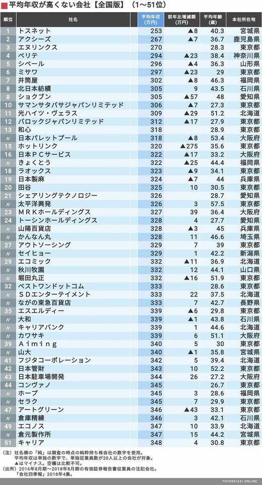 政治・経済・投資 #賃金・生涯給料ランキング 前の記事 次の記事 平均年収「全国ワースト500社」ランキング 平均年収が400万円を下回るのは173社 3分で読める 公開日時:2019/01/07 05:00 田中 久貴 東洋経済データ事業局 フォロー 1/11 PAGES 2/11 PAGES 次ページが続きます:【次に100位まで】 3/11 PAGES 4/11 PAGES 5/11 PAGES 6/11 PAGES 7/11 PAGES 8/11 PAGES 9/11 PAGES 10/11 PAGES 11/11 PAGES