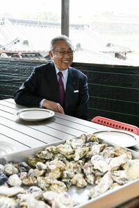 「カキにはシャブリが合う、と言われていますが、実は合わないものも多いんです。しかし、梅津さんの育てたカキは最高にクリーミー。なので『まずはシャブリから』がお勧めですね」。なるほど、クリーミーなカキとシャブリの爽やかな味わいが交じり合い、徳岡会長も思わず笑顔に。
