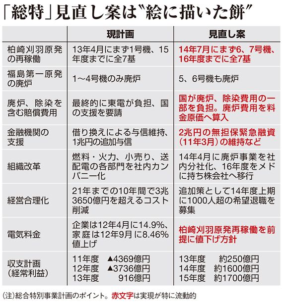 泉田知事自身、新しい総特で再稼働時期を14年7月とする案が浮上していることに対し、「何の根拠もない。絵に描いた餅だ」と批判している。原発再稼働のメドが立たない以上、再稼働を前提とした収支計画も、電気料金値下げ方針も、まったく当てにならないと言える。