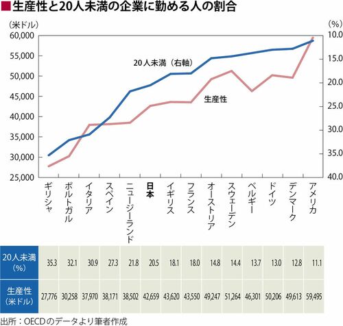 日本、そして同じように生産性の低いスペイン、イタリアは、極めて小さい企業で働く人の割合が多いという共通の特徴があります。一方、高い生産性を誇るアメリカではその割合はわずか11%です。