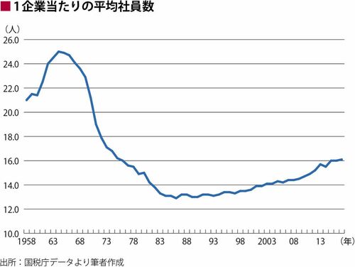 実は日本でも、企業の規模が拡大する傾向はすでに進み始めています。少しずつですが、1企業当たりの社員数は上がっているのです。