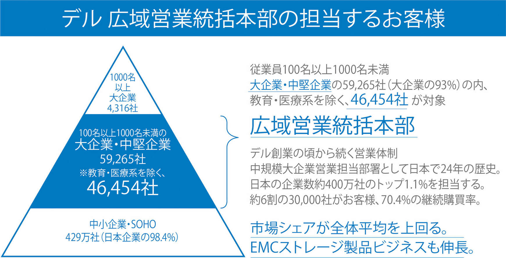 PCをはじめサーバーやクラウド、IT・情報システム全般にわたって幅広いサービスを提供しているデルは、電話やメールを活用したインサイドセールスで業績を伸ばしてきた。とりわけ、従業員数100人以上1000人未満の中堅企業市場で存在感を示している。