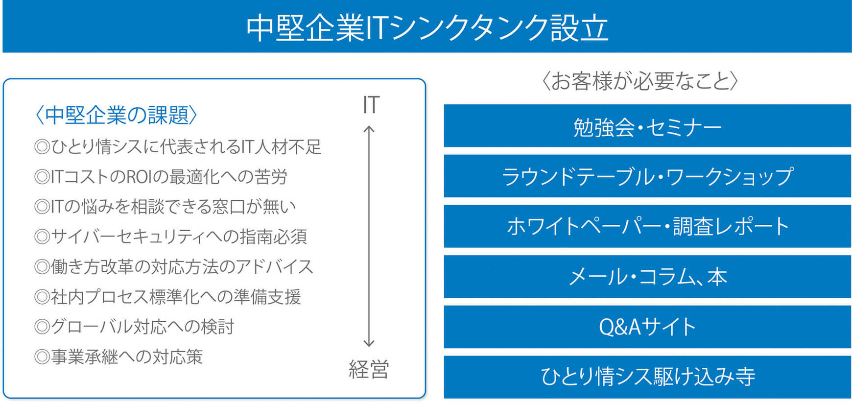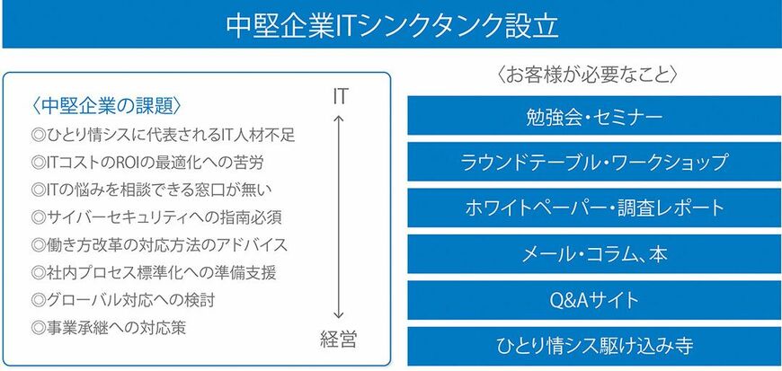 中堅企業ITシンクタンクでは、BCP(事業継続計画)や働き方改革、労務管理などのIT寄りのものから、マーケティングやグローバル展開、事業承継などの経営寄りのものまで、中堅企業が抱えるさまざまな課題を扱う。各分野の専門家である研究員がそうした課題の解決に取り組み、そこで構築した解決策を全国の課題解決にも生かしていくという。きめ細かなサービスを展開するため、中堅企業の経営者やIT担当者の悩みなどに一問一答形式で答えるサイトの立ち上げも検討している。