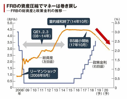 一連の動きの背景にあるのが、マネーの収縮・逆流だ。FRBは2008年のリーマンショック以降、金利引き下げと3度にわたる量的緩和(QE)で、大量の資金を市場に供給してきた。経済が回復に向かうとQEを終了し、2017年に政策金利の引き上げを着実に推進。同年10月からバランスシート(BS)の縮小にも着手している。