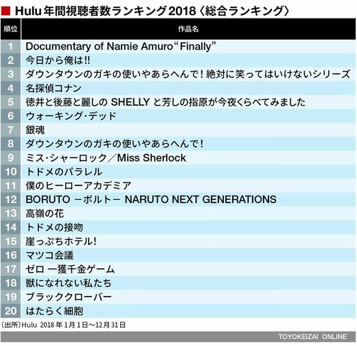 Huluを運営するHJホールディングスが発表した2018年の「Hulu年間視聴者数ランキング」からも変化の動きが見て取れます。まずは総合ランキングの結果を見ると、安室奈美恵さんの引退までの1年間に密着した話題作のドキュメンタリー『Documentary of Namie Amuro “Finally”』が堂々1位。そのほかトップ10にはアニメ『名探偵コナン』(4位)、海外ドラマ『ウォーキング・デッド』(6位)など稼ぎ頭のコンテンツが並んでいます。
